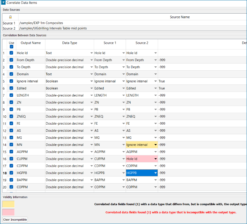 Note: Any fields that have different names can be manually matched up. However, validity warnings will be displayed if data types (eg. text and integer) are found for the data sources.