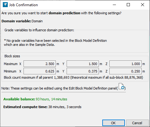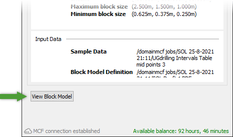 Note: DomainMCF accepts regular block models (having all blocks the same size), and sub-blocked block models with a parent to sub-block ratio of ½, ¼, ⅛ or 1/16. Imported block model definitions will be rounded to the nearest size compatible with DomainMCF.Whether you supply an existing definition or generate one, you can inspect and modify the parameters by clicking