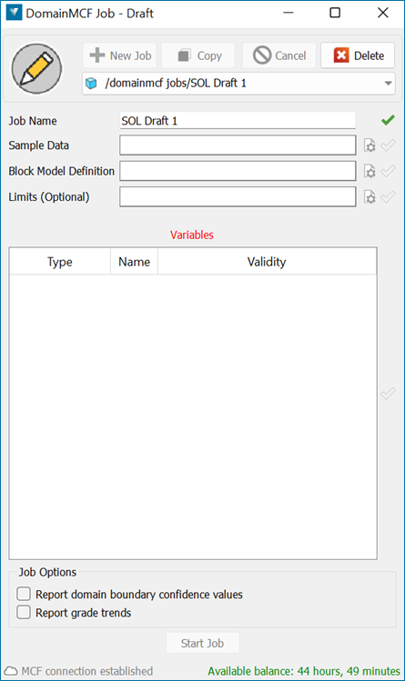 The first time you open the DomainMCF Jobs panel, a new draft is created for you ready to fill out. Subsequently, if there are existing jobs in the list, you’ll need to start a new job by clicking