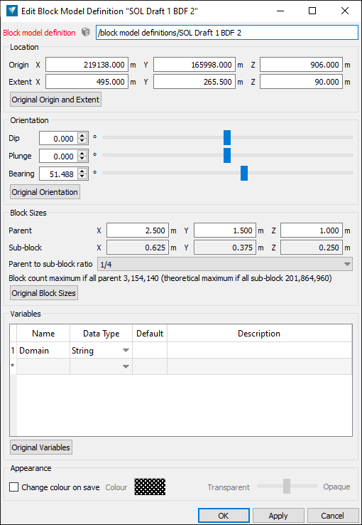 Under Appearance, select the Change colour on save checkbox to apply a specific colour and translucency to the block model definition object. This affects the visualisation of the object when viewed in a view window.
