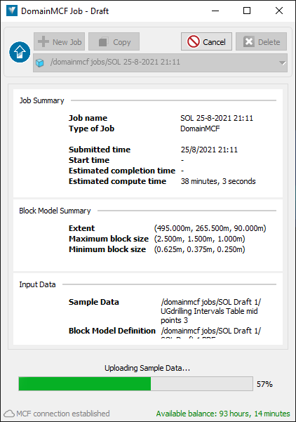 Your job begins uploading to the MCF server for processing, and the DomainMCF Job tool displays a summary of the job details.