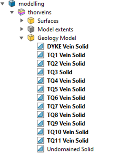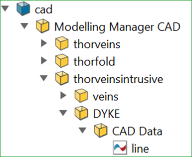 CAD data - When a Vein model is added to the Chronology tree, an empty container structure is created within the standard cad container in the Project data explorer using the naming hierarchy of the Modelling Group and Chronology tree. Sub-containers will be created for each Vein model for each parameter that accepts CAD data as an input. Containers will be created for: