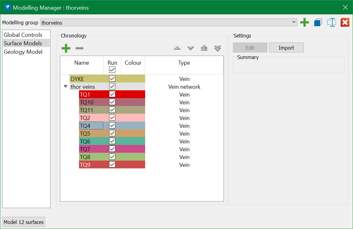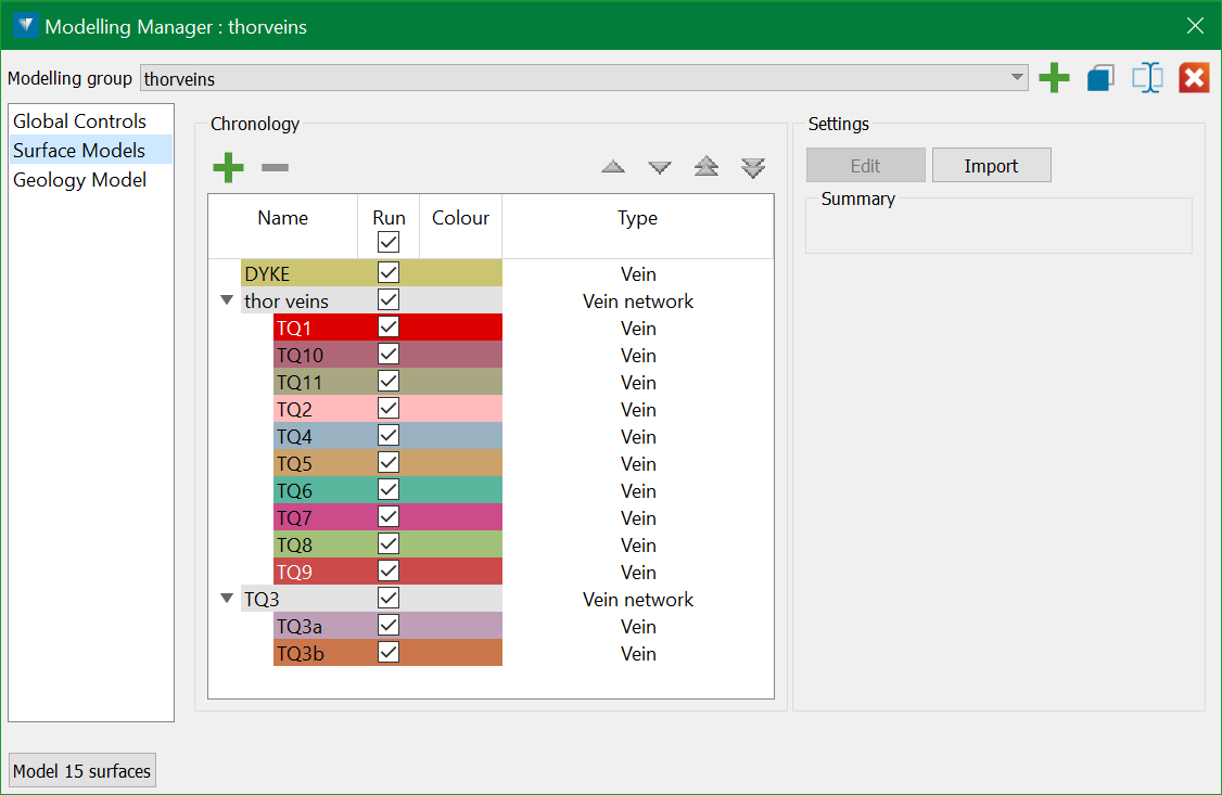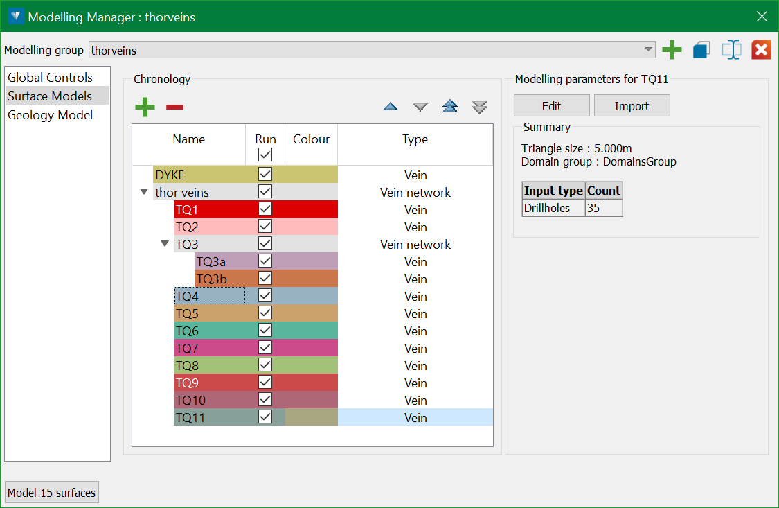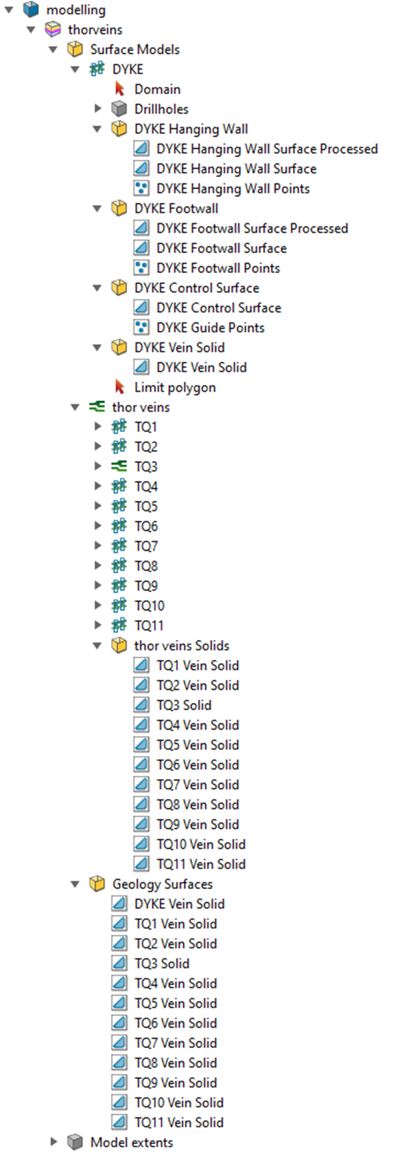 A Geology Surfaces container will be created which contains all the final Modelling and Network outputs of all parent level items in the Chronology tree.