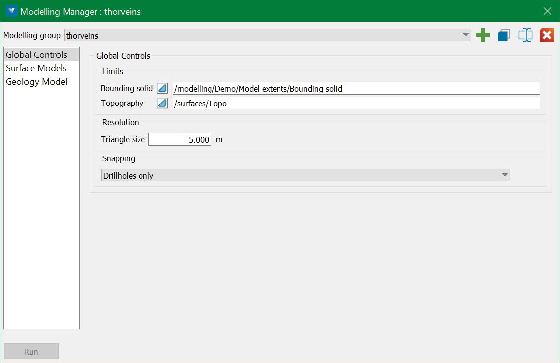 The Modelling Manager provides a structured and automated framework for building an entire geological model and defining how all the different units interact with each other to form the final triangulation surfaces and solids (volumes).