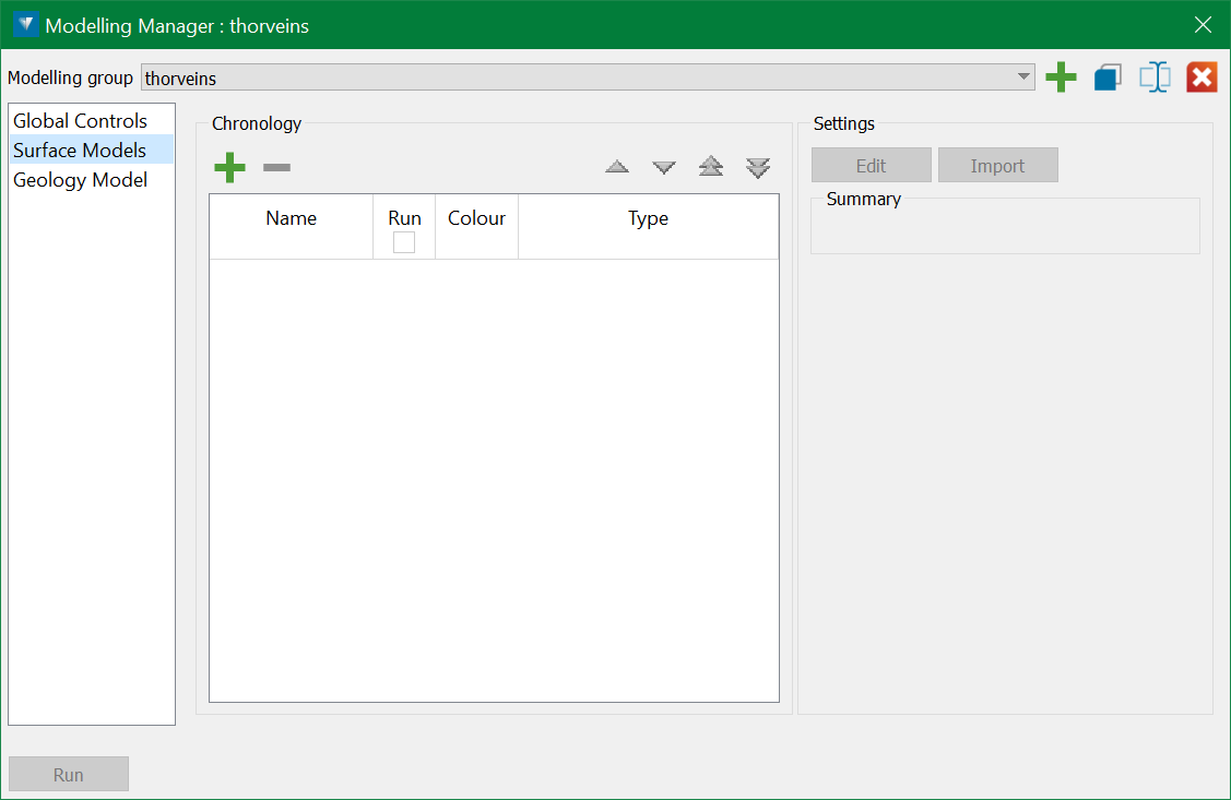 Once the desired settings have been set for each surface in the Chronology tree, the checkbox in the Run column can be selected, which will add the selected surface to the pool of surfaces to be modelled.