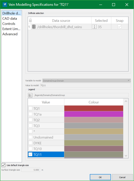 The Triangle size defines the global maximum triangle size used in any implicit modelling derived models. The default is set to 5m, but careful consideration to an appropriate triangle size for each model is recommended, as smaller triangle sizes increase smoothness and accuracy of the implicit modelled surfaces relative to input data, but also increase the processing time and file size. This value can be manually overridden as required for each individual model within the group. - Snapping