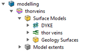 When the Model button is pressed, each surface in the pool will be modelled and any Vein network rules will be applied to Veins within networks. All outputs for the selected modelling method will be saved into the modelling container, following the hierarchy of the Modelling Group.