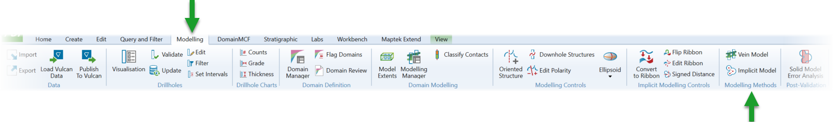 The tools to create vein and implicit models are all located on the Modelling ribbon tab.