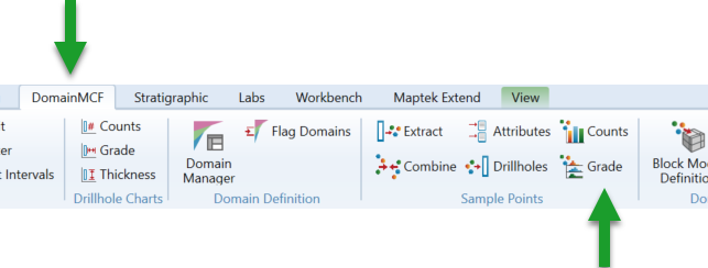 To generate a grade chart, select the block model and then on the ribbon, navigate to DomainMCF > Sample Points >