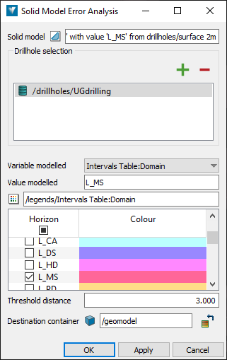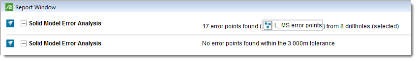 Solid model error analysis is a way of checking that the data used to generate a model lies inside or on the final model. It can be applied to any solid model, and as such is useful to check the output of vein or implicit modelling. Use the