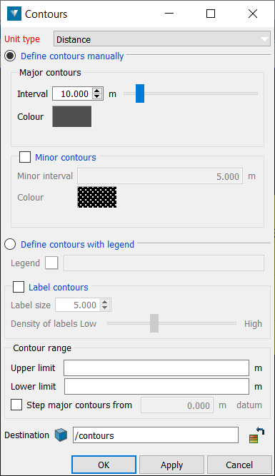 Select Define contours manually and select the Interval and Colour for the major contours. Alternatively, select Define contours with legend and drag and drop a numeric legend into the Legend field using the middle mouse button.