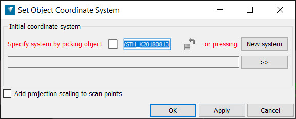 Specify a coordinate system either by automatically transferring the coordinate system applied to another object. To transfer a coordinate system automatically from another object, give focus to the Specify system by picking object field, then either: