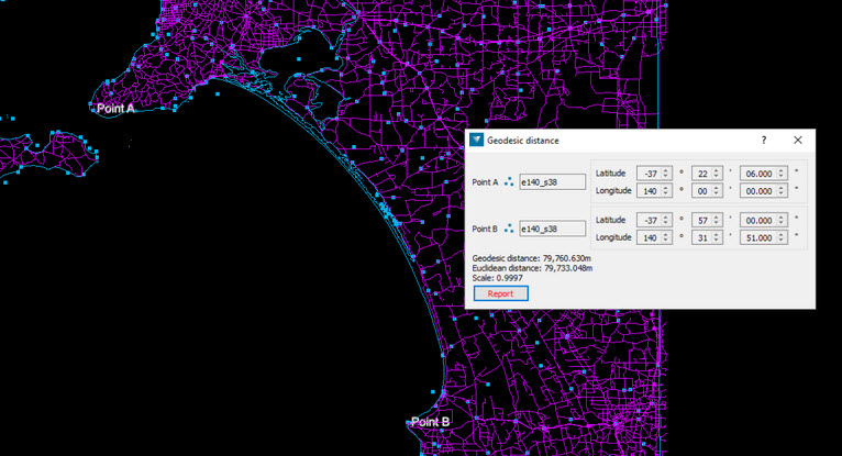 The coordinates of two points are reported in the panel along with the geodesic and Euclidean distances between the points. The Euclidean distance is the distance between the two points measured using the point's X and Y coordinates.