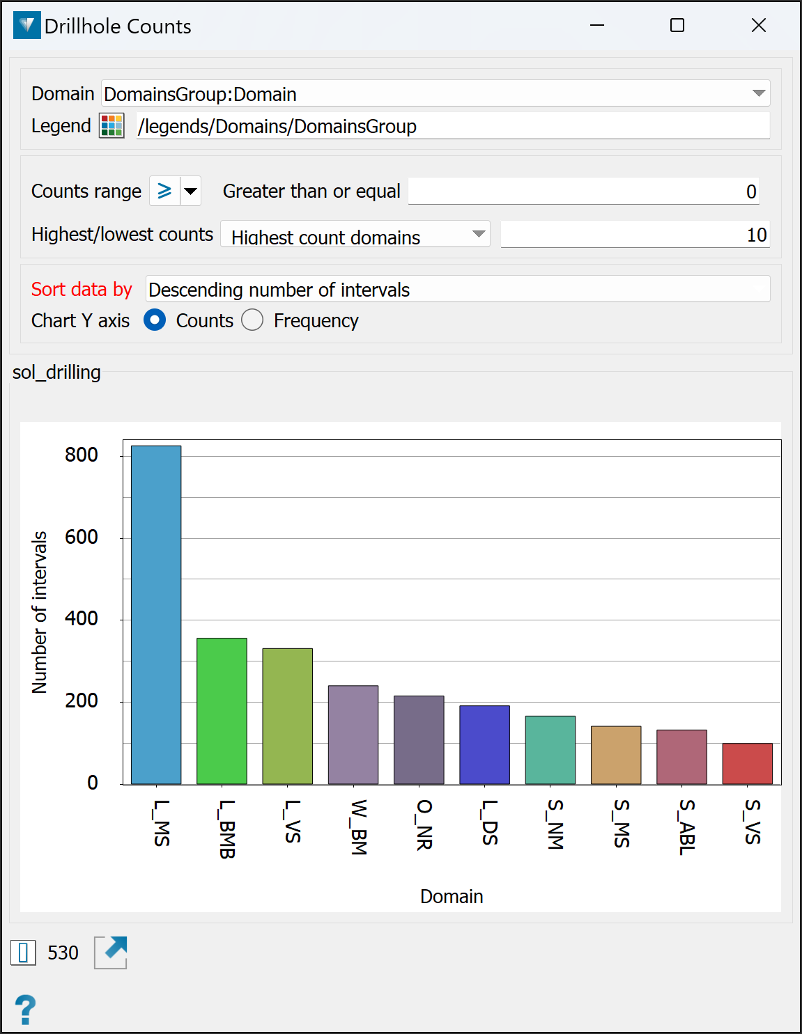The drillhole counts chart updates dynamically whenever you change the drillhole selection, or any of the chart options.