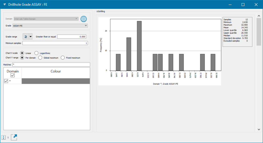 Drillhole grade charts display the sample distributions for a given grade within selected domains.