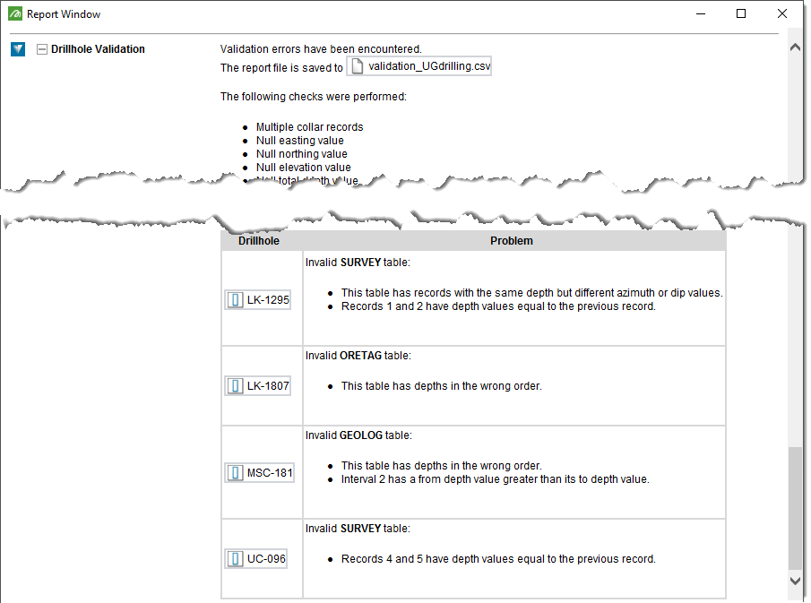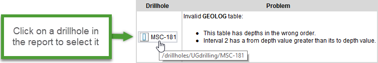 The Drillhole Validation report displayed in the report window is interactive—click on a drillhole