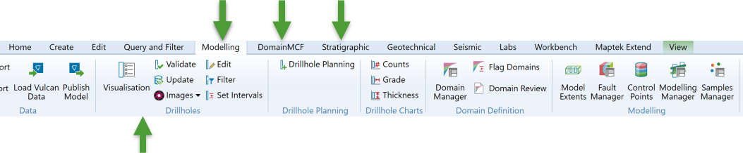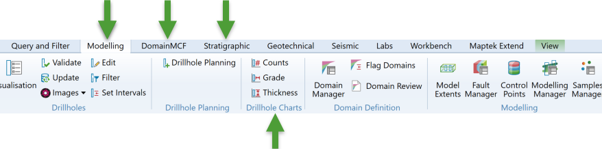 The drillhole visualisation, validation and charting tools are located on the Modelling, DomainMCF and Stratigraphic ribbon tabs in the Drillholes group.