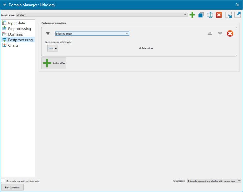 Modifiers change interval boundaries according to some criterion when domaining is run. For example, you can set up modifiers to split or combine intervals. Global modifiers created on this panel are applied to every domain—but you can configure modifiers for individual domains in a later step.