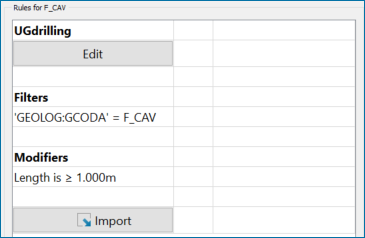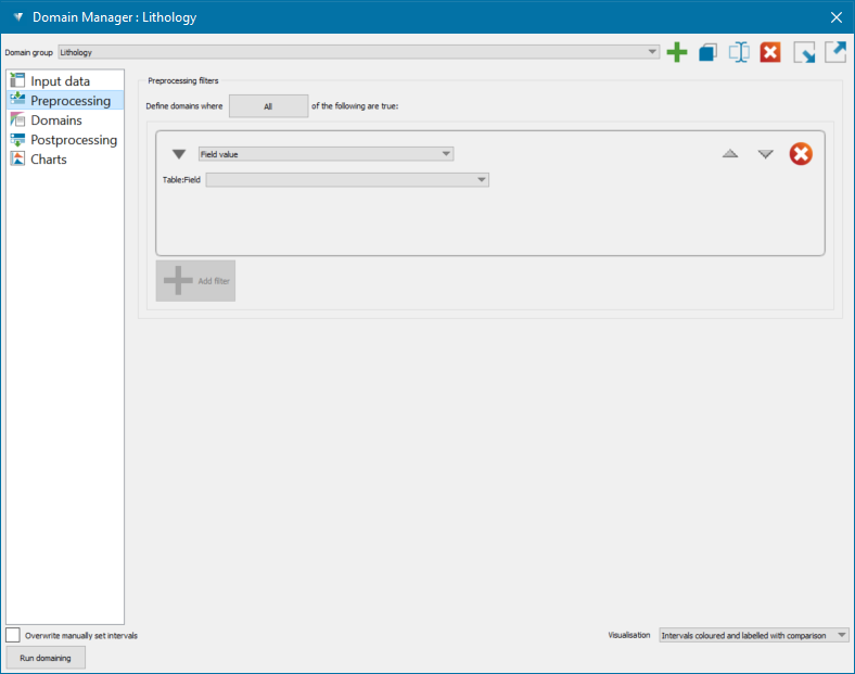Configure and apply preprocessing filters before defining the domain rules. These data filters define what intervals the domaining is run on. These can be based on a field in the database or a region such as a blast solid in open pit models.