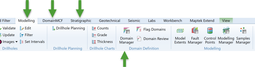 The domaining tools are located in the Domain Definition group on the Modelling, DomainMCF and Stratigraphic ribbon tabs.