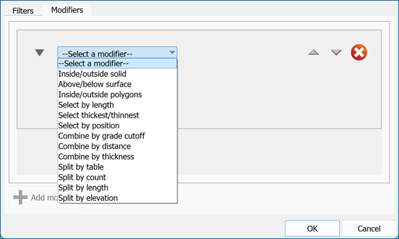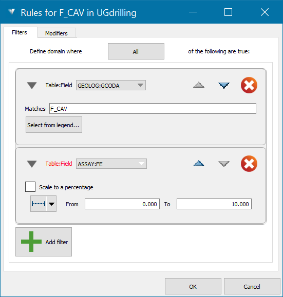 There are two kinds of rules that you can apply to intervals: filters and modifiers. Filters are rules that are applied to an interval to determine whether it should be included as part of a domain or not. Modifiers are rules that are applied to change interval boundaries according to some criterion. A domain’s filters are applied before modifiers are applied. If the Match entire drillhole filter option is selected, all intervals for a drillhole are passed on to the modifier.