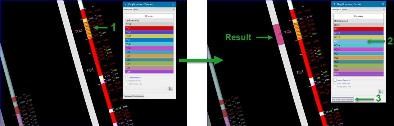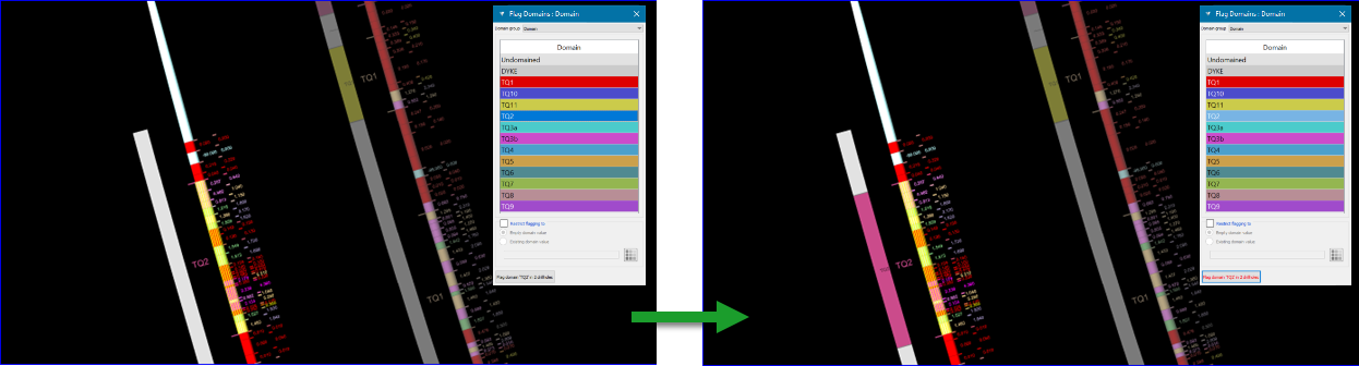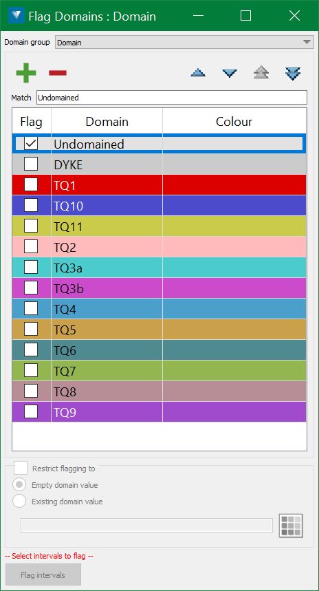 For narrow vein workflows, where domain intervals are defined less by rules and more by manual interpretation, this can be achieved using the Flag Domains tool.