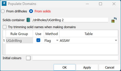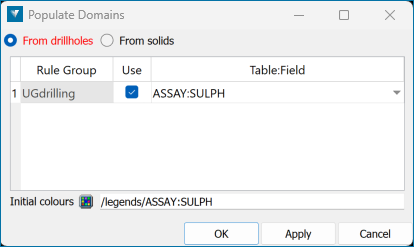 From drillholes: Creates domains based on drillhole field values. A matching filter is automatically added for each domain.