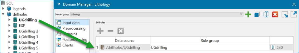 Select the input data for domaining first. In the Drillholes list, specify the set of drillhole inputs you want to run domaining on.