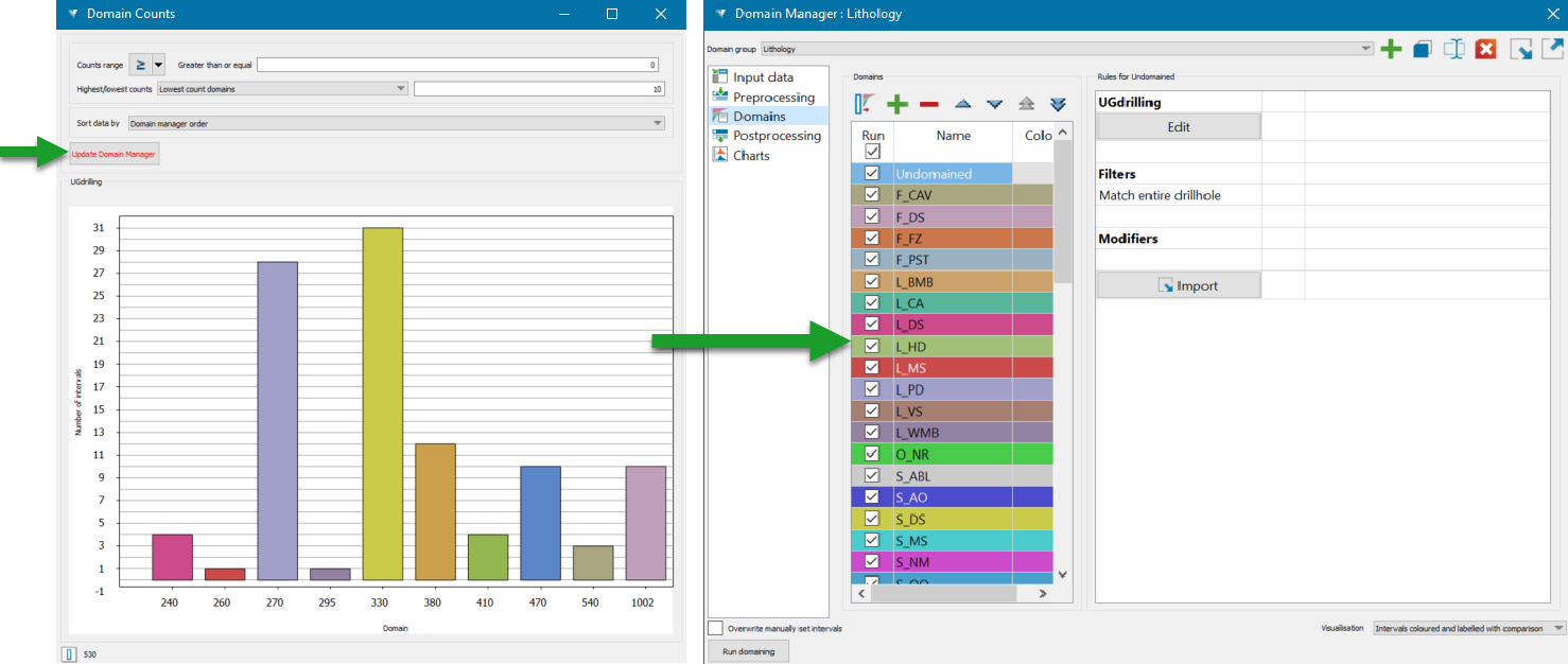 The Domains section of the Domain Manager will be populated with the domain codes extracted from the drillholes.