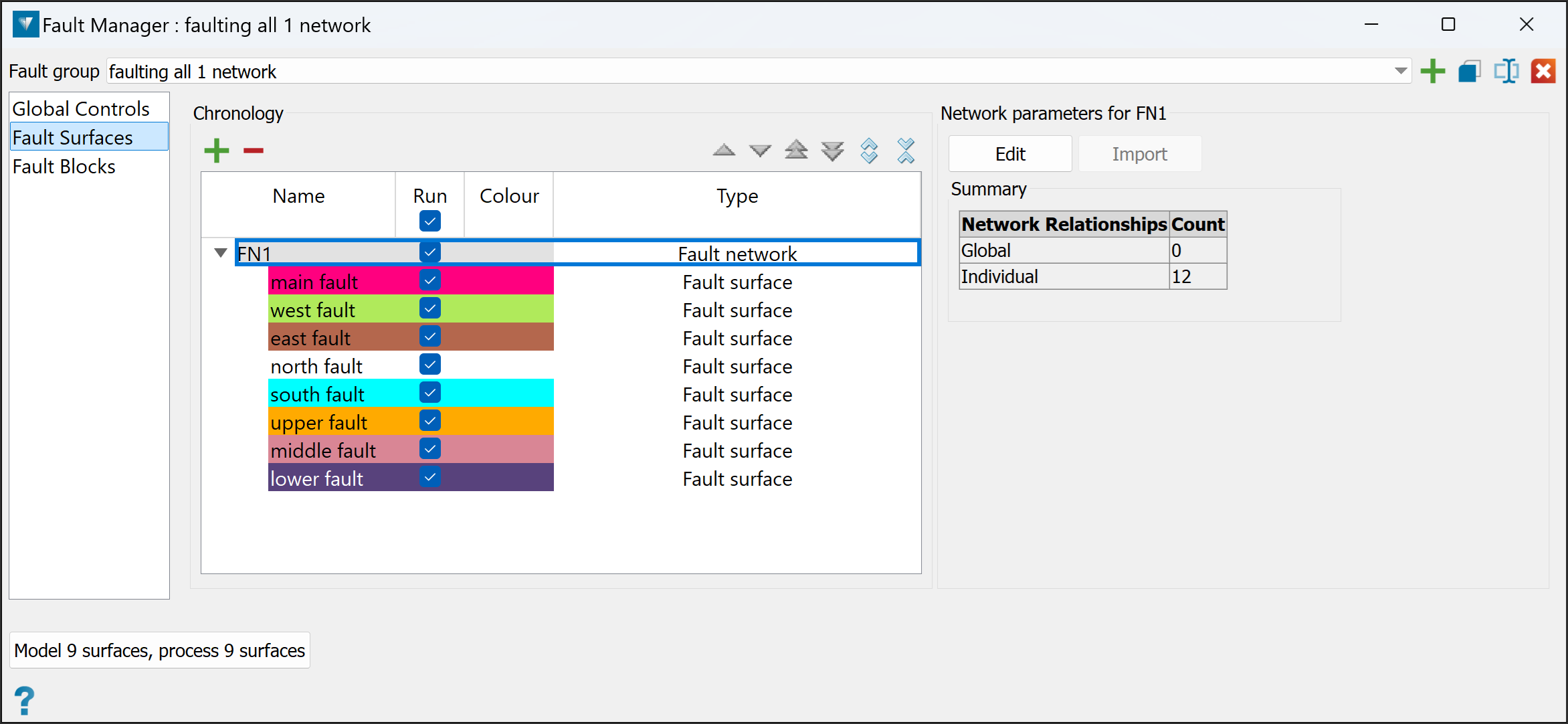 Note: For nested fault networks, any child network inherits the Global network relationships of its parent. This is not shown on the panel of the child network.