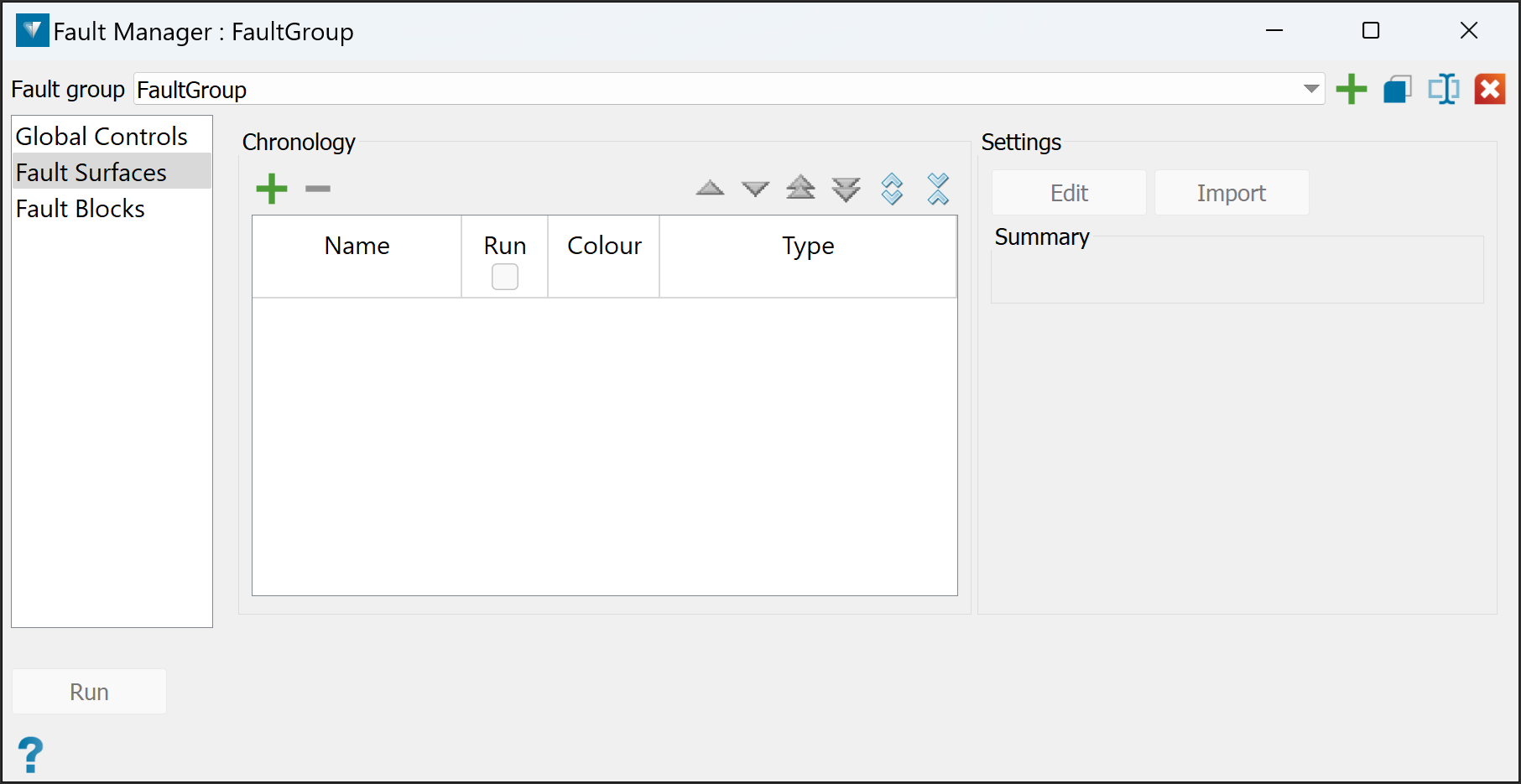 Once the desired settings have been set for each surface in the Chronology tree, select the Run checkbox to add the selected surface to the pool of surfaces to be modelled.