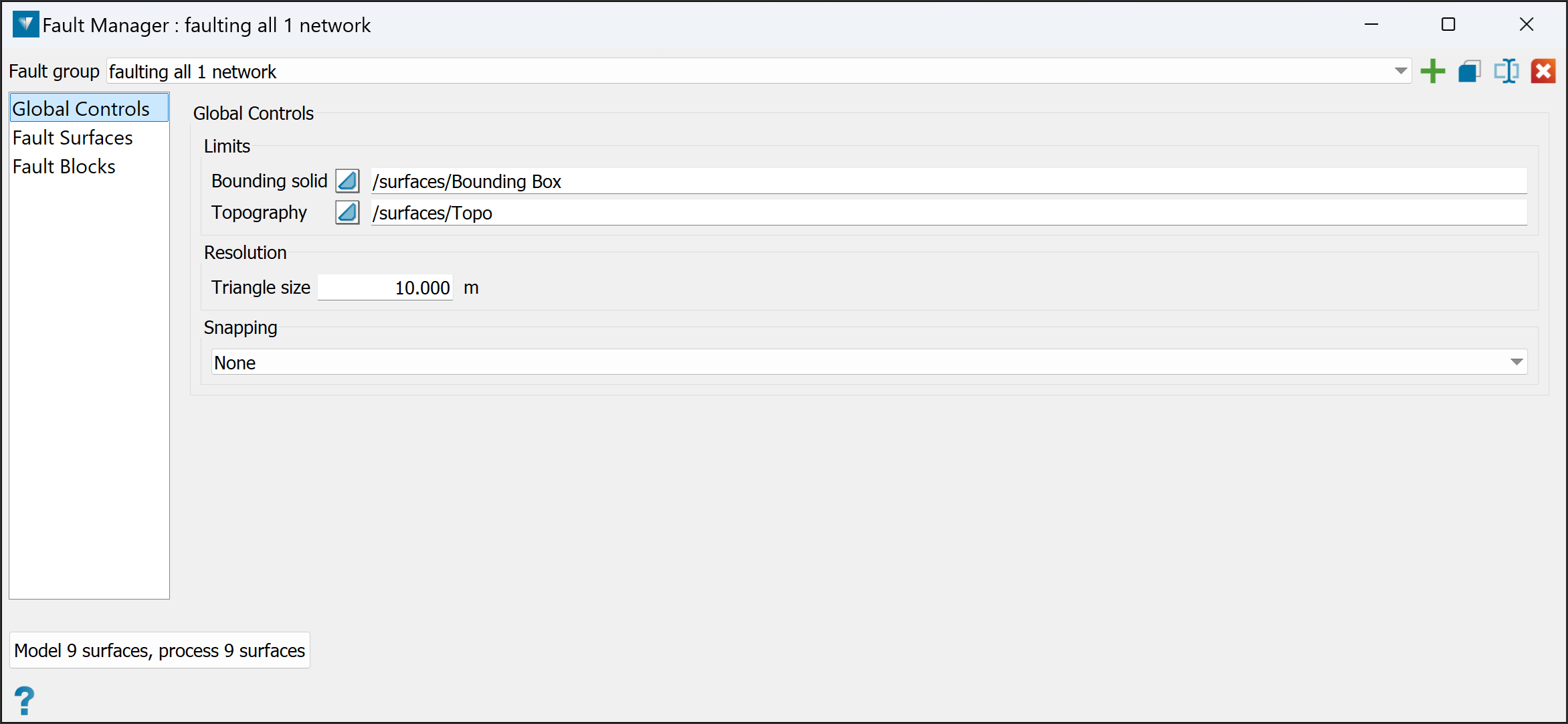 Important: It is recommended to check that all surfaces added to the Fault Blocks are valid. While the Fault Manager should automatically report surface validity, click here for more information on checking surface validity. Valid surfaces are important as invalid surfaces can greatly affect the processing speed of the boolean operations and the validity of the Fault Blocks outputs.