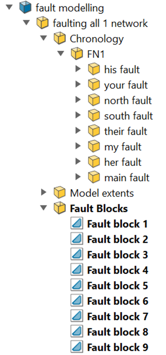 Fault networks will have a container created that will contain the output of all fault surfaces within the network after the network relationships have been applied. These containers can be further expanded to access individual fault surface items.