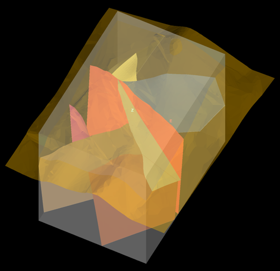 The Bounding solid defines the extent limits of the modelling region. All the fault surfaces in the fault group will be limited to the bounding solid, so it is important to ensure the solid covers the volume to be established. -