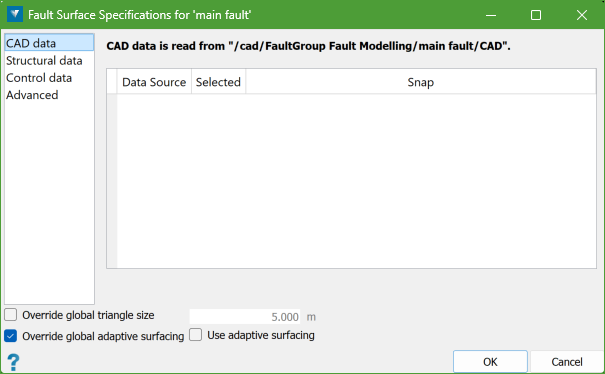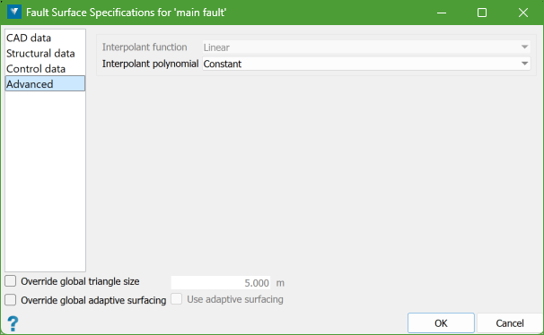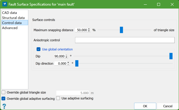 Override global triangle size —When enabled, the custom surface triangle size is used. Otherwise, the global setting from the Fault Group Global Parameters is applied.