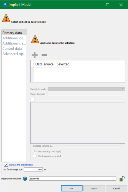 Implicit models can be constrained and controlled in many ways. Step 2 above described adding interpretive data as a way of controlling the model. Switch to the Control data tab for other methods of controlling the model, described below.