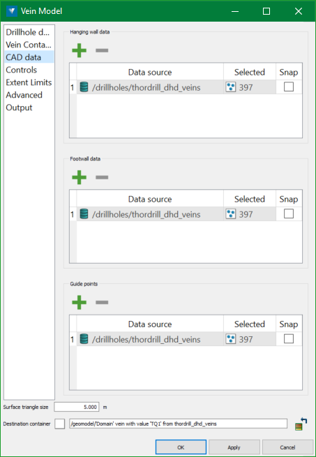 Data points—choose whether to generate point sets of the hanging wall, footwall and/or middle of the vein.