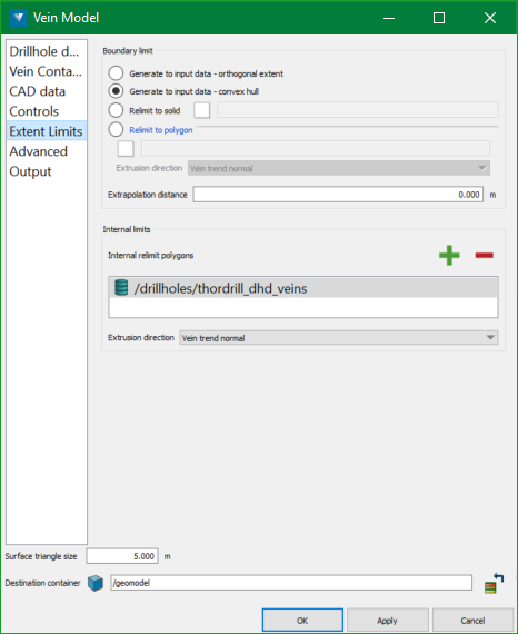 Polygons can be selected to be used as internal relimiting regions too. This can be particularly useful if you do not want to use the Pinch out surfaces option, but want manual control over a region where a hole is to be created within the vein solid, such as surrounding barren drillholes.