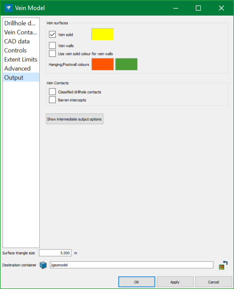 Vein walls—select this checkbox to save the processed hanging wall and footwall surfaces that are used to create the vein solid.
