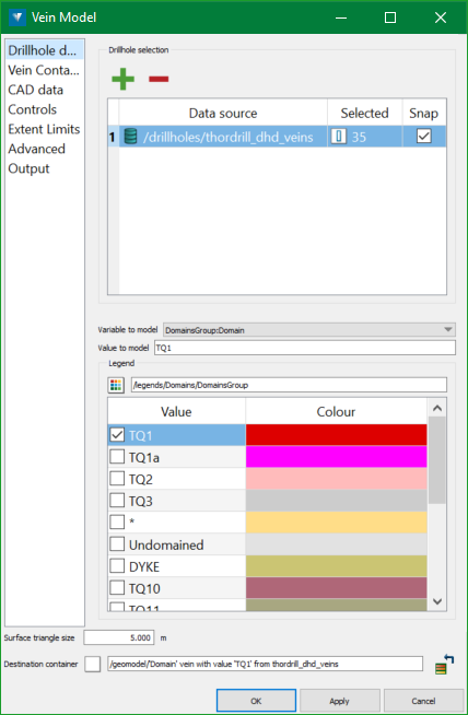 The vein model tool will model a single vein from supplied source data. You can supply drillholes, CAD data, or both.