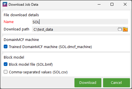 You can choose to download the output block model as either a block model file (.bmf) or comma-separated values file (.csv). Alternatively, you can download the trained DomainMCF machine. For more details, see Downloading a job.