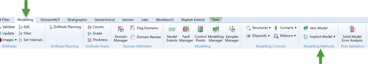 The tools to create vein and implicit models are all located on the Modelling ribbon tab.