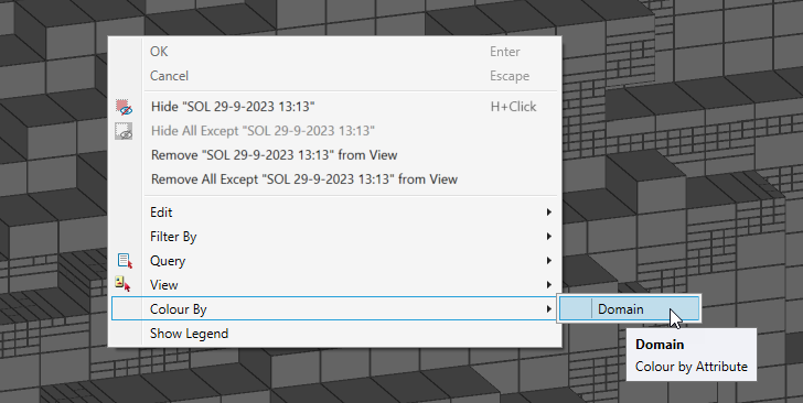 .dmcf_machine). This information is presented as a confusion matrix, comparing input training sample points to the predicted values at those locations. The rows of the confusion matrix sum to 100%, indicating the proportion of each domain code predicted as another domain code. Overall accuracy details, including both balanced and regular accuracy, are also shown. This helps assess how well the trained model reflects the provided data. To know more, see Finished Jobs.To colour the block model, right-click on it in the view, and in the context menu select Colour By > [Domain Attribute].