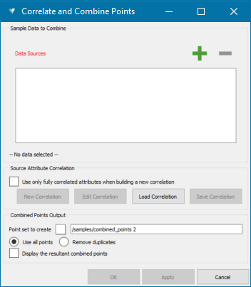 Set up a new correlation to link the fields between the point sets. You can create a new correlation or load an existing correlation. Optionally, you can select the option Use only fully correlated attributes when building a new correlation to use only those attributes for which there is a representative in each source.