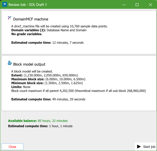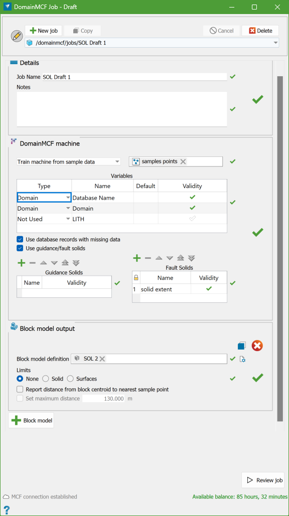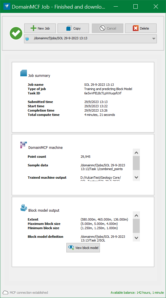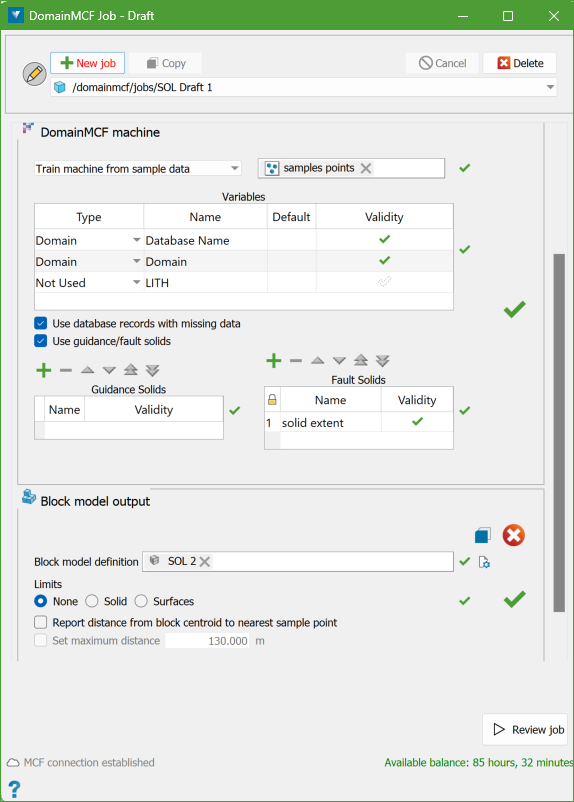 Once Review Job is run, the following panel is displayed which gives information about the DomainMCF machine and Block model output to be processed.