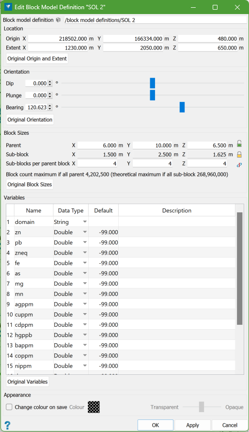 Under Appearance, select the Change colour on save checkbox to apply a specific colour and translucency to the block model definition object. This affects the visualisation of the object when viewed in a view window.