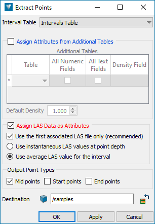 Optionally, you can also add downhole geophysical log data values (from LAS files) as attributes to the points created. The Assign LAS Data as Attributes option is enabled only if there is any LAS data associated with the selected holes.