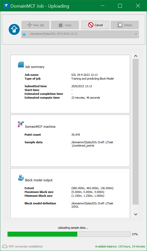 Your job begins uploading to the MCF server for processing, and the DomainMCF Job tool displays a summary of the job details.