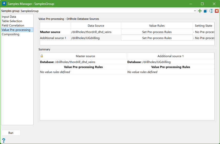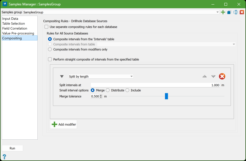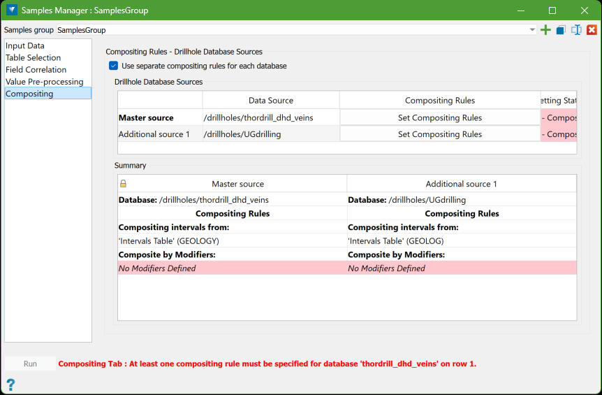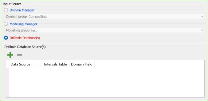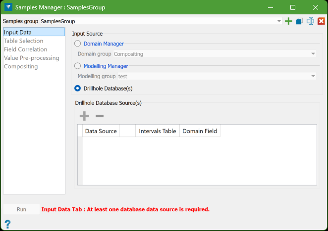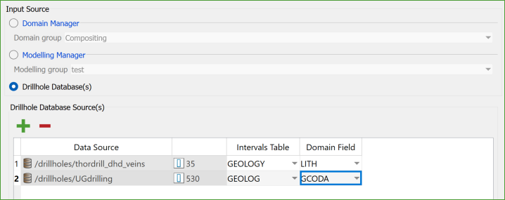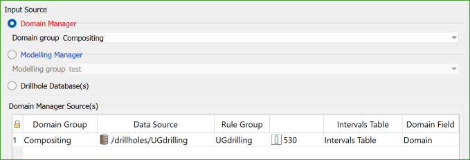 The Samples Manager can only composite drillholes from one input source at a time (either Domain Manager, Modelling Manager, or Databases), but it keeps specifications for each source type separate in the Samples Group object. While you can store specs for multiple source types in one Samples Group, it is better to have separate specifications for each task for easier auditing.