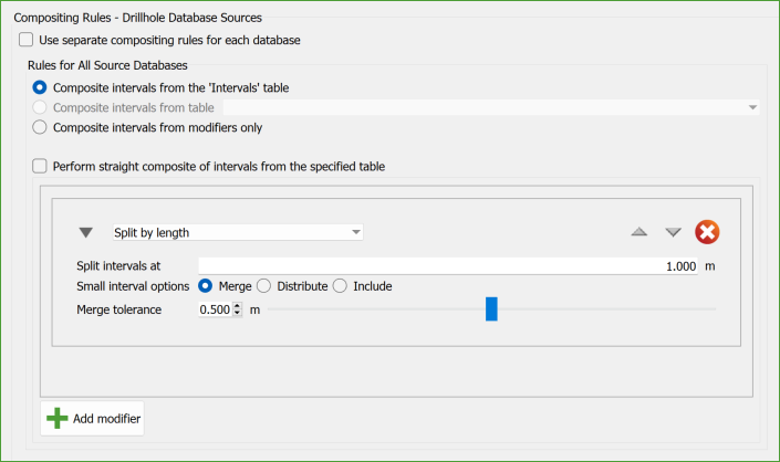 This option applies compositing modifiers directly to the entire length of the drillhole rather than specific intervals from a table.